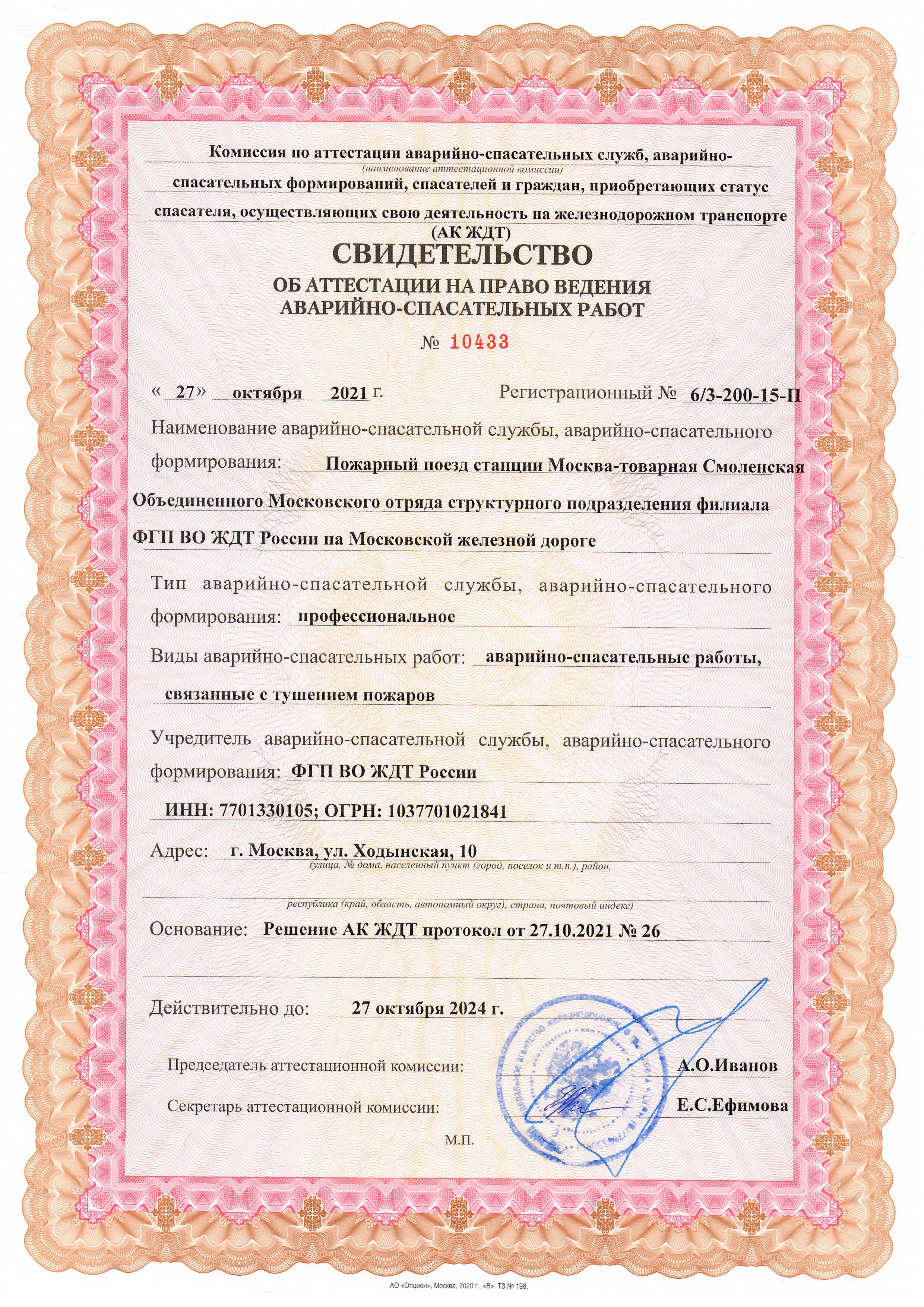 В соответствии с Положением о проведении аттестации аварийно-спасательных служб, аварийно-спасательных формирований, спасателей и граждан, приобретающих статус спасателя, иными законодательными и нормативными правовыми актами федеральных органов исполнительной власти, уполномоченных на решение задач в области железнодорожного транспорта и пожарной безопасности, все пожарные поезда прошли аттестацию на право ведения аварийно-спасательных работ (далее - АСР), связанных с тушением пожаров.
