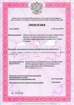 Для ведения работ по тушению пожаров и проведения аварийно-спасательных работ у ФГП ВО ЖДТ России имеются лицензия и свидетельство на право ведения АСР в чрезвычайных ситуациях.