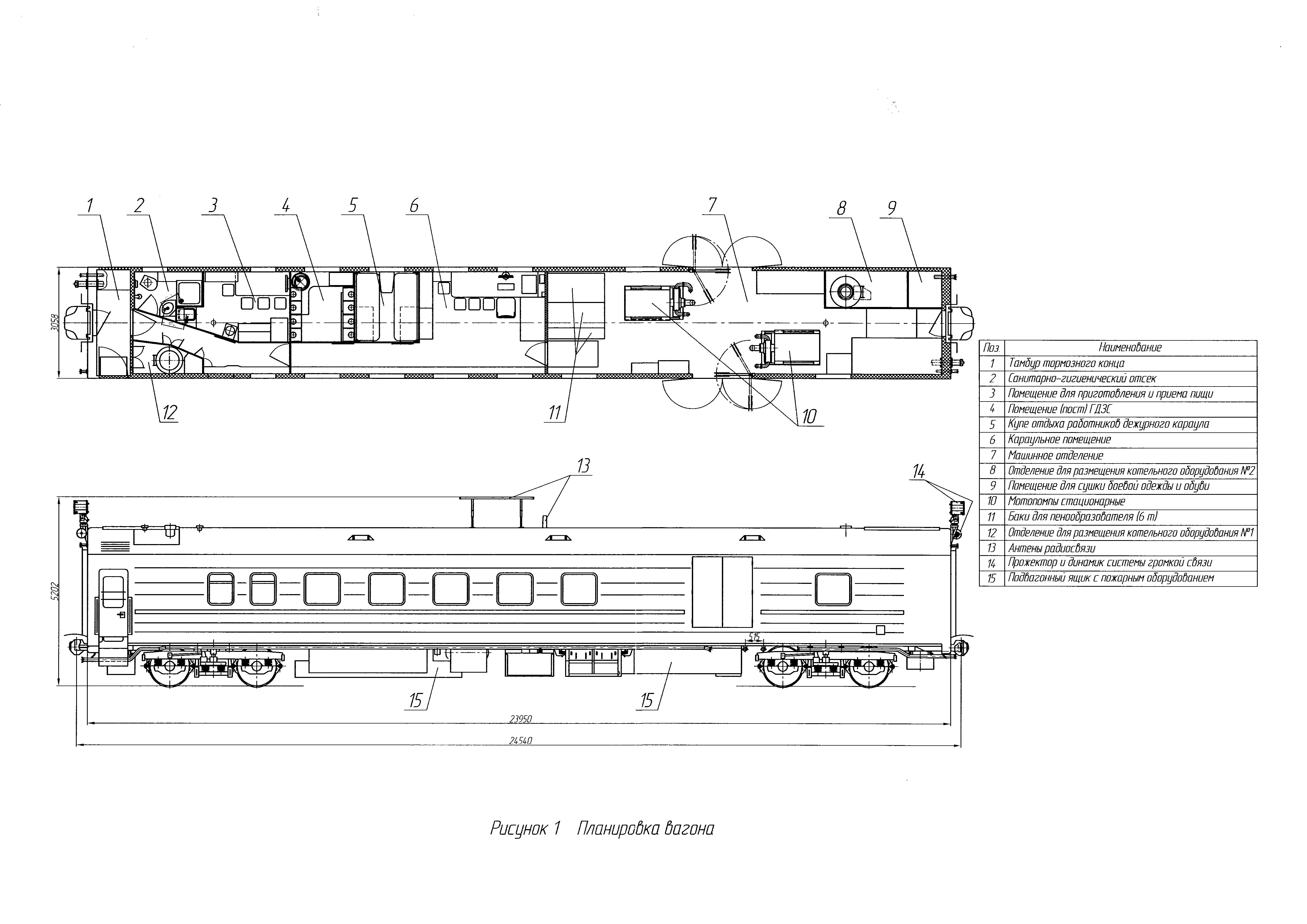 В состав пожарного поезда входят вагон-насосная станция с пожарной техникой, пожарным и специальным оборудованием и установками подачи огнетушащих веществ и материалов, а также две цистерны-водохранилища с запасом воды 60 тонн каждая.